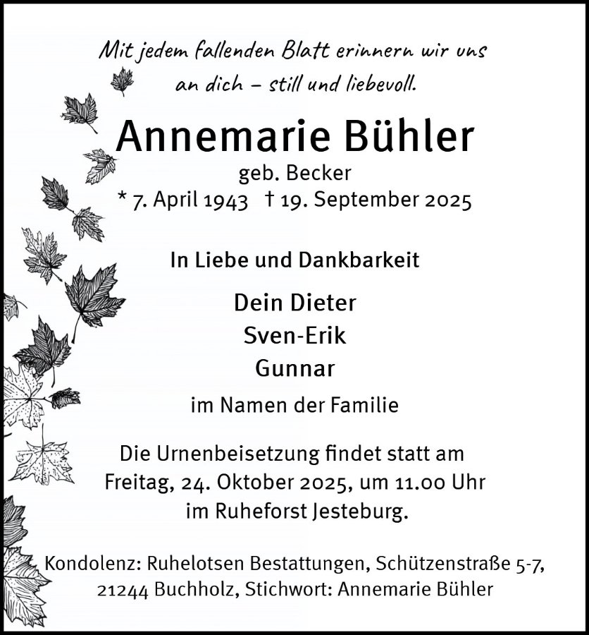 wenn jemand geht, der Ihnen nahestand, bleibt oft erst mal nur Leere. Doch die Erinnerungen können diese Leere mit der Zeit ein Stück weit füllen. Wir wünschen Ihnen, dass Sie in den nächsten Tagen und Wochen immer wieder an die besonderen Augenblicke denken, die Sie mit Ihrem Menschen geteilt haben – vielleicht ein Gespräch, ein Lächeln oder etwas, das nur Sie beide verstanden haben.