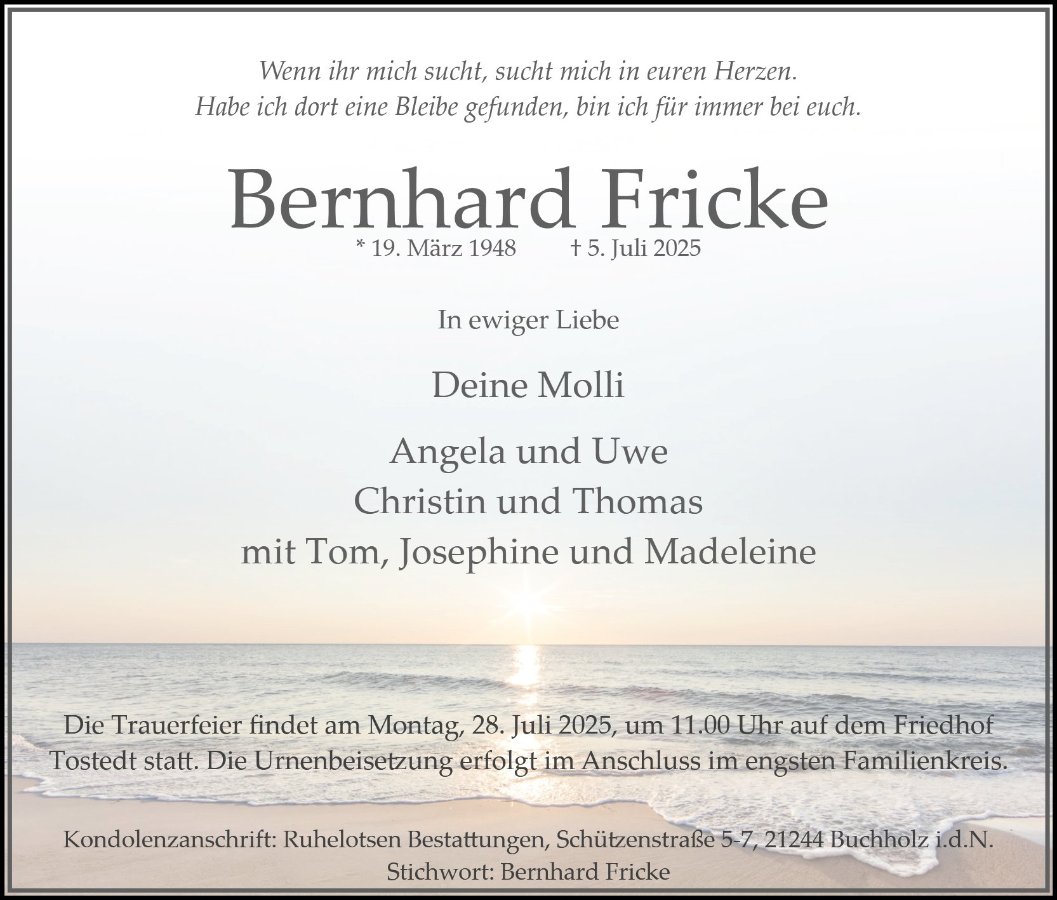 jede Erinnerung an einen geliebten Menschen gleicht einem leuchtenden Schatz, der in unserem Herzen bewahrt wird und uns selbst in den dunkelsten Stunden ein sanftes Licht schenkt. Für die Zeit, die vor Ihnen liegt, wünschen wir Ihnen von Herzen, dass diese kostbaren Erinnerungen Ihnen nicht nur Trost spenden, sondern auch die Kraft geben, weiterzugehen. Mögen Sie inmitten des Alltags immer wieder kleine Augenblicke erleben, in denen Sie innehalten, ein Lächeln finden und die Wärme der gemeinsamen Erlebnisse spüren – sei es durch ein vertrautes Lied, einen Duft oder eine flüchtige Erinnerung, die plötzlich auftaucht.