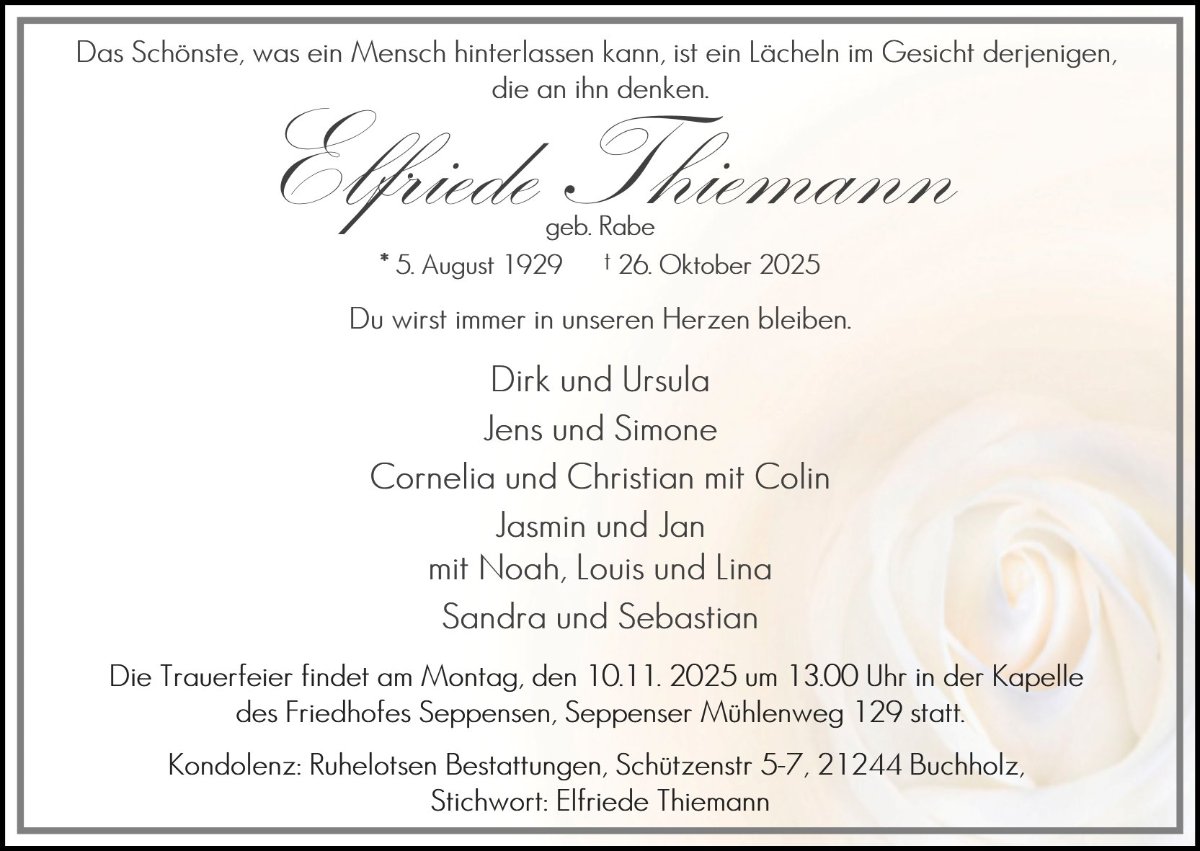 jede Erinnerung an einen geliebten Menschen gleicht einem leuchtenden Schatz, der in unserem Herzen bewahrt wird und uns selbst in den dunkelsten Stunden ein sanftes Licht schenkt. Für die Zeit, die vor Ihnen liegt, wünschen wir Ihnen von Herzen, dass diese kostbaren Erinnerungen Ihnen nicht nur Trost spenden, sondern auch die Kraft geben, weiterzugehen. Mögen Sie inmitten des Alltags immer wieder kleine Augenblicke erleben, in denen Sie innehalten, ein Lächeln finden und die Wärme der gemeinsamen Erlebnisse spüren – sei es durch ein vertrautes Lied, einen Duft oder eine flüchtige Erinnerung, die plötzlich auftaucht.