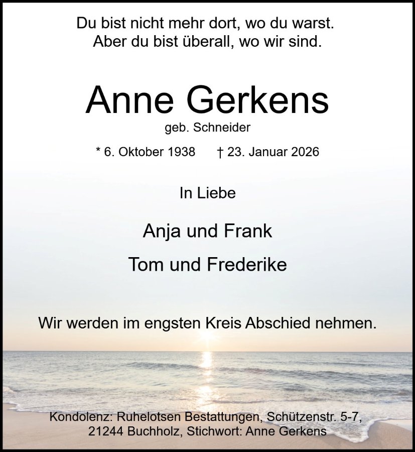 Diese Gedenkseite möchten wir als einen besonderen Ort gestalten: einen Raum, in dem Sie und andere diese wertvollen Momente teilen, festhalten und miteinander verbinden können. Ein Ort, der nicht nur das Andenken lebendig hält, sondern auch zeigt, wie sehr die Gemeinschaft in schweren Zeiten tragen kann. Als Zeichen unserer Anteilnahme und in stillem Gedenken zünden wir, Ihre Ruhelotsen, die erste Kerze auf dieser Gedenkseite an – ein kleines Licht, das für die Liebe und die Verbindung steht, die niemals erlischt.