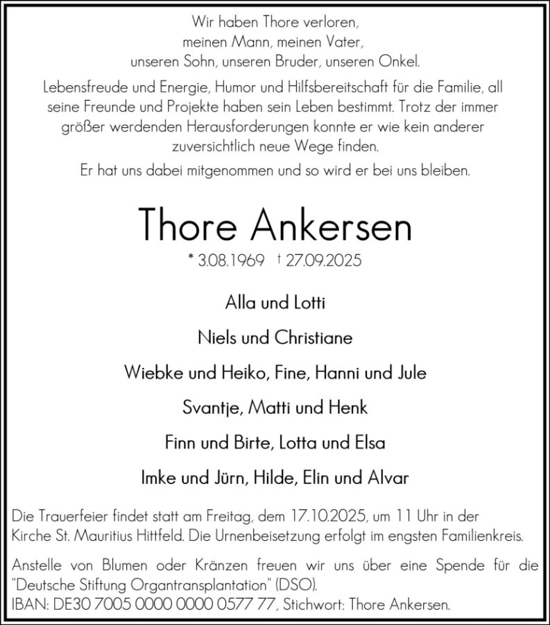 Lieber Thore, wir haben uns erst spät kennen gelernt, aber Du hast die folgende Zeit durch Deine Kraft und unbändigen Willen sehr geprägt. Dein Lebensmut war trotz vieler Rückschläge etwas, von dem man (wir) viel lernen konnten. Gerne hätten wir noch so vieles auf die Beine gestellt, leider wurdest du wohl woanders benötigt...
